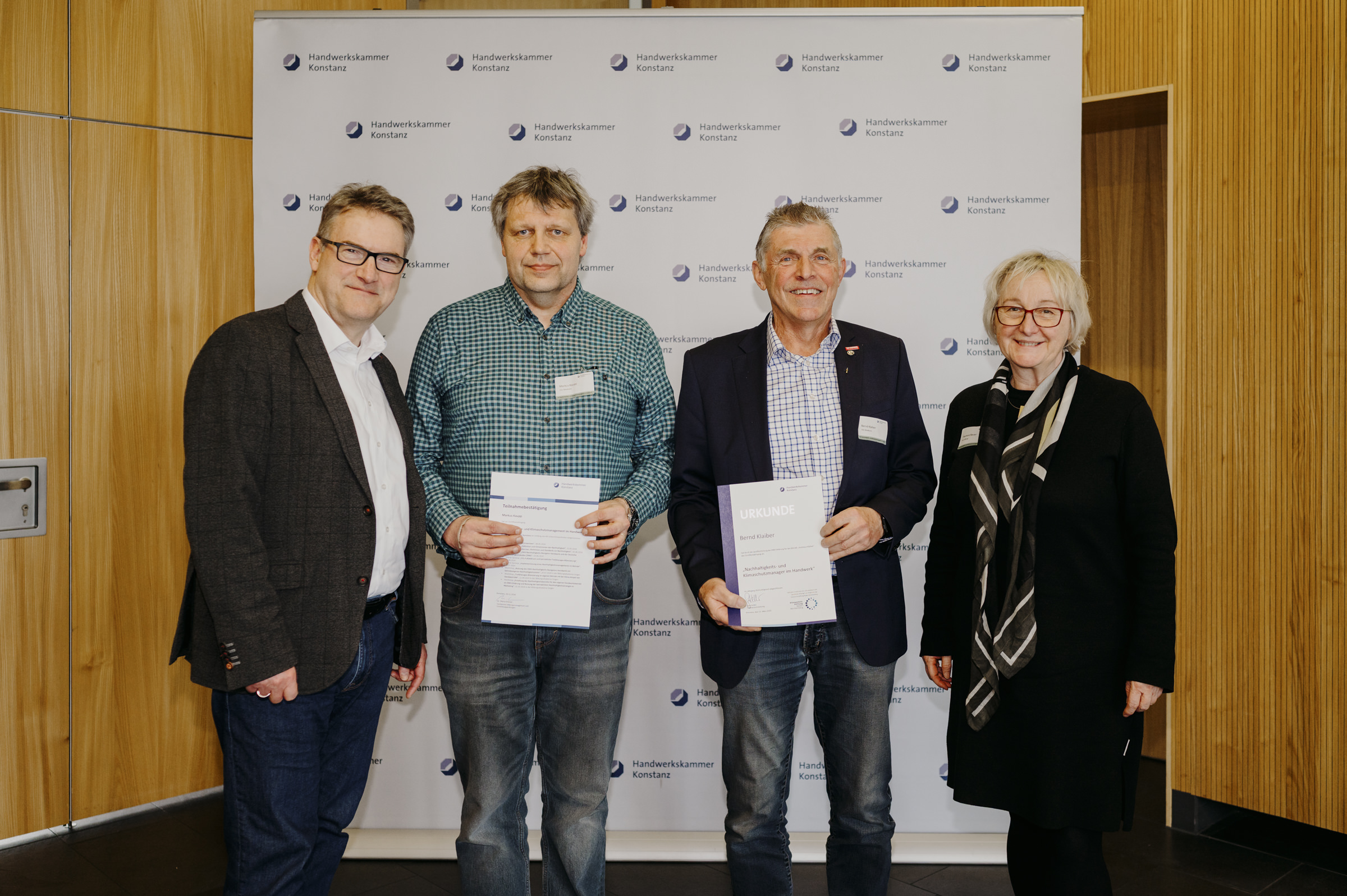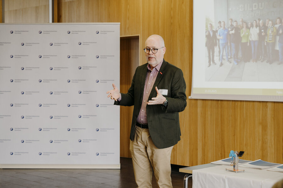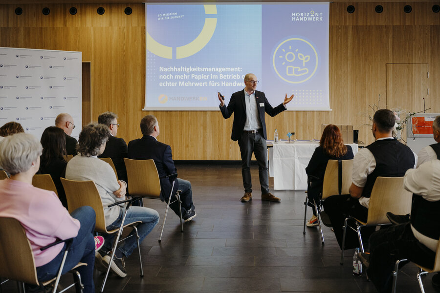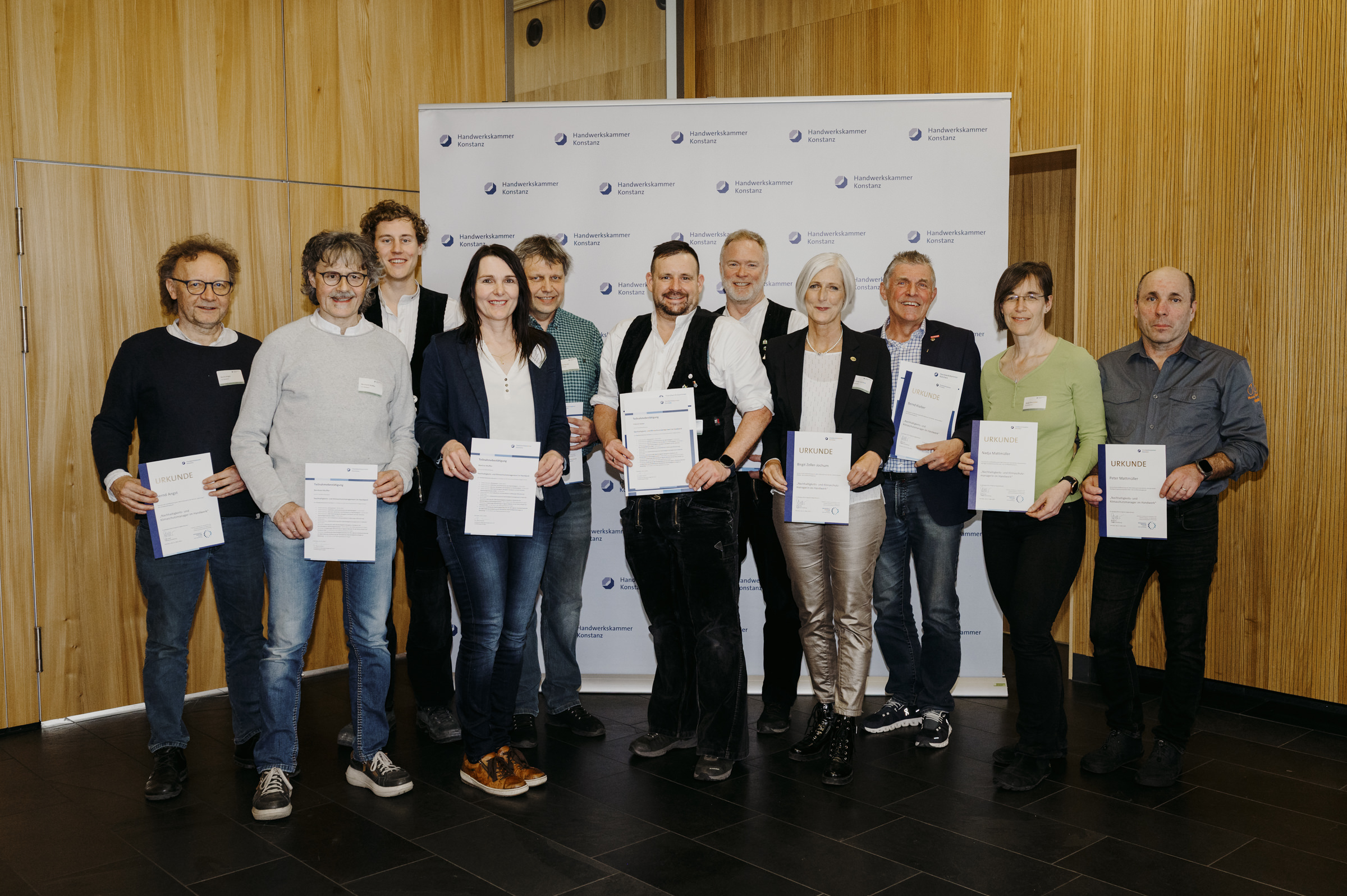 Gefördert wurde die Handwerkskammer Konstanz bei der Entwicklung und Erprobung des Zertifikatslehrgangs „Nachhaltigkeits- und Klimaschutzmanager/-in im Handwerk". Im Rahmen eines Pilotlehrgangs wurden ab Mai 2024 die Inhalte erstmals in einem für die Teilnehmenden kostenfreien Angebot vermittelt. Den 20 Teilnehmenden wurde in dem Lehrgang neben dem allgemeinen Verständnis zu und vor allem Kenntnisse zu Methoden der Messung ökologischer und im Betrieb vermittelt. Die Teilnehmenden konnten im Rahmen des Kurses einen Nachhaltigkeitsbericht für ihren Betrieb anfertigen und wurden bei der Aufnahme des Berichts in die Datenbank des Deutschen Nachhaltigkeitskodex (DNK) unterstützt. Im März 2025 erhielten die Teilnehmenden im Rahmen einer Veranstaltung ihre Abschlusszertifikate.