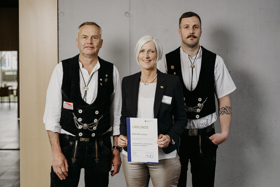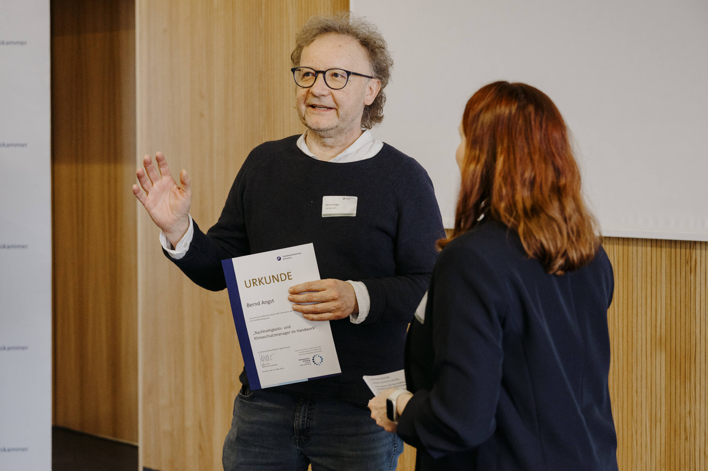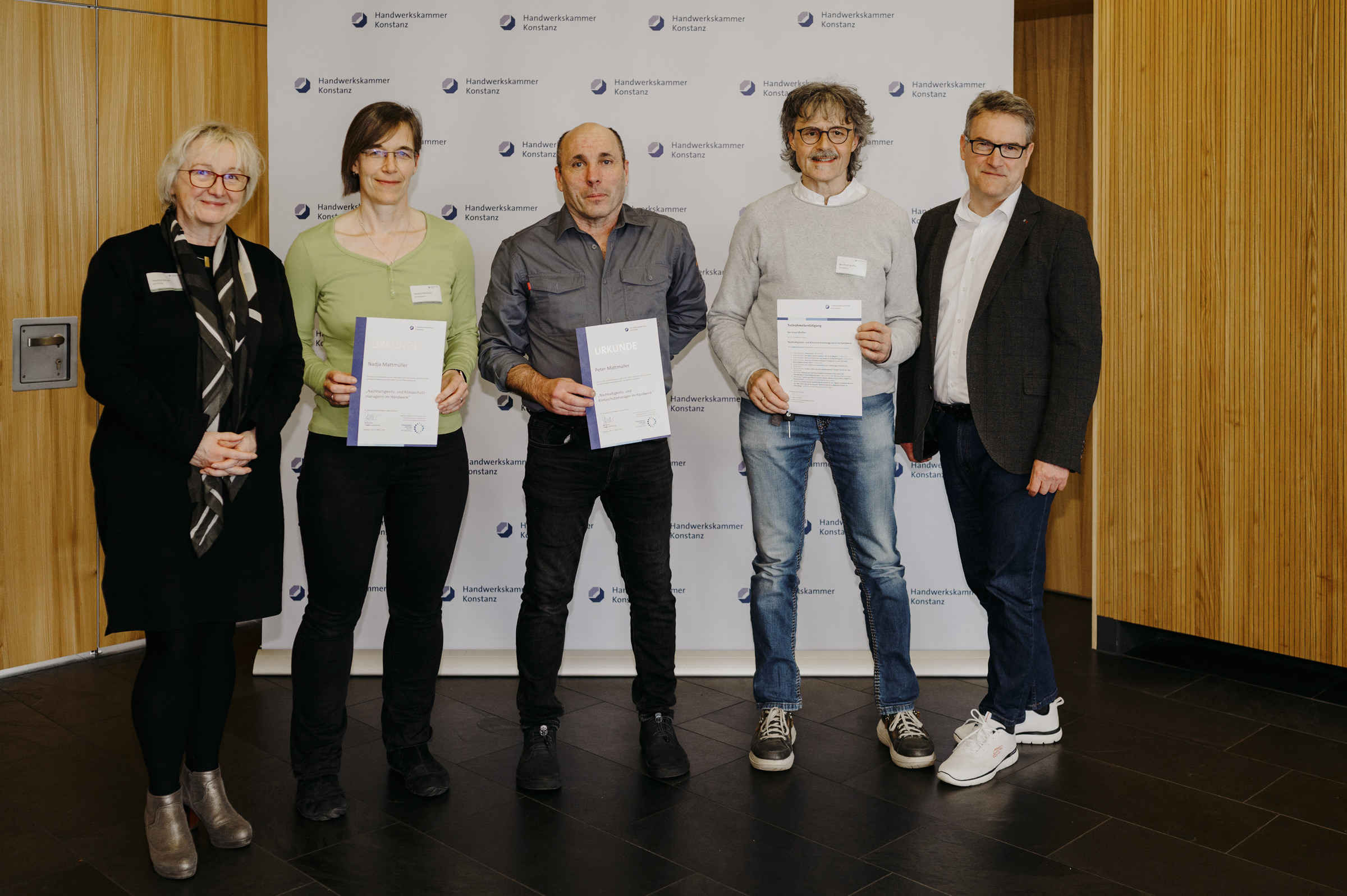 Gefördert wurde die Handwerkskammer Konstanz bei der Entwicklung und Erprobung des Zertifikatslehrgangs „Nachhaltigkeits- und Klimaschutzmanager/-in im Handwerk". Im Rahmen eines Pilotlehrgangs wurden ab Mai 2024 die Inhalte erstmals in einem für die Teilnehmenden kostenfreien Angebot vermittelt. Den 20 Teilnehmenden wurde in dem Lehrgang neben dem allgemeinen Verständnis zu und vor allem Kenntnisse zu Methoden der Messung ökologischer und im Betrieb vermittelt. Die Teilnehmenden konnten im Rahmen des Kurses einen Nachhaltigkeitsbericht für ihren Betrieb anfertigen und wurden bei der Aufnahme des Berichts in die Datenbank des Deutschen Nachhaltigkeitskodex (DNK) unterstützt. Im März 2025 erhielten die Teilnehmenden im Rahmen einer Veranstaltung ihre Abschlusszertifikate.